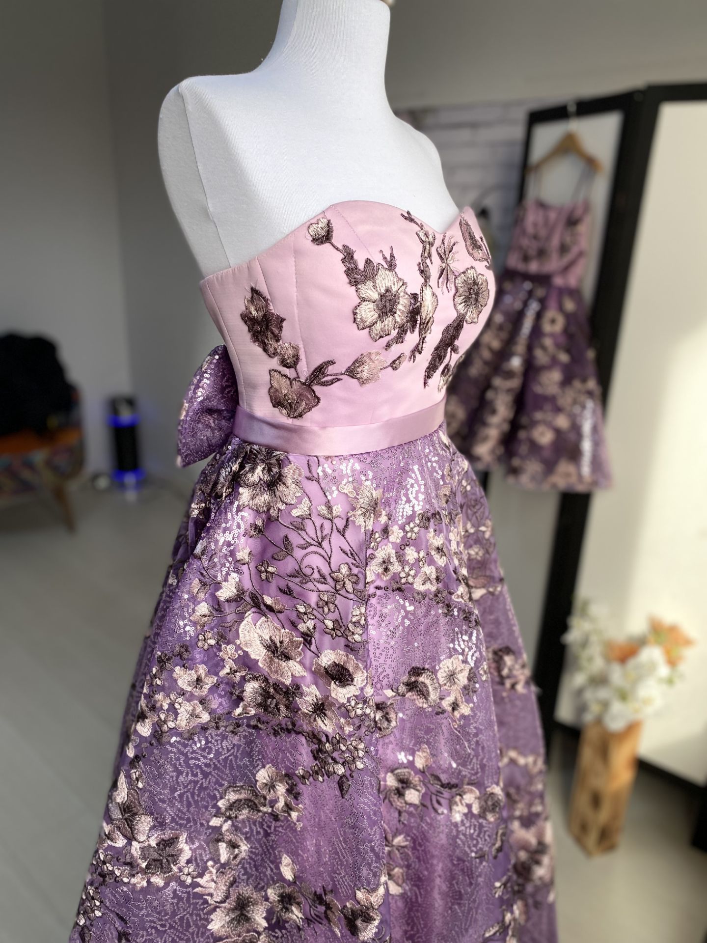 İple bağlamalı 36-38-40 bedenlere uyumlu çiçek işlemeli astarlı tasarım abiye. Çocuk kombini bulunmaktadır.