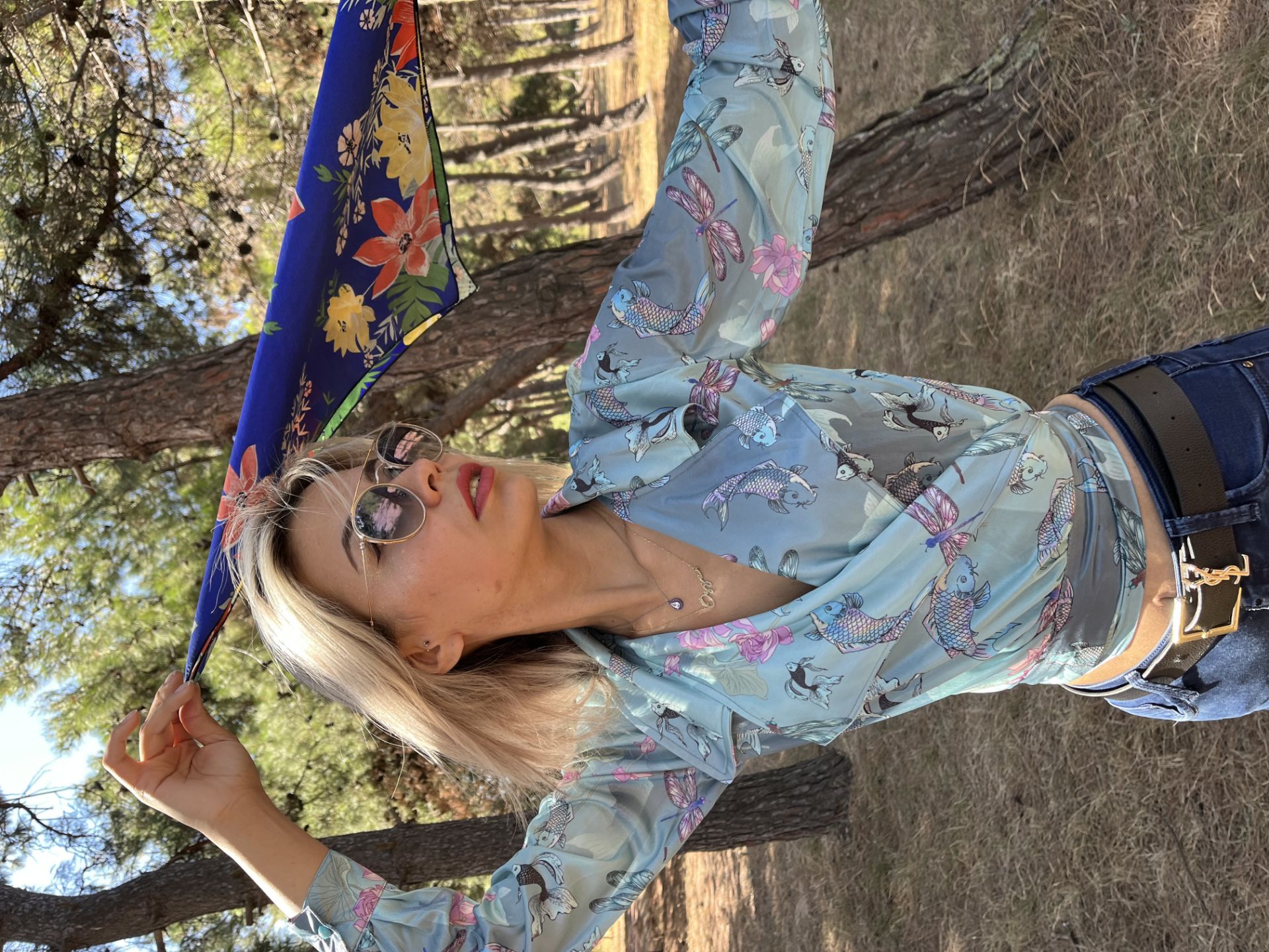 Geniş, ikiz yakalı çapraz arkadan bağlamalı crop model ince kumaş gömlek