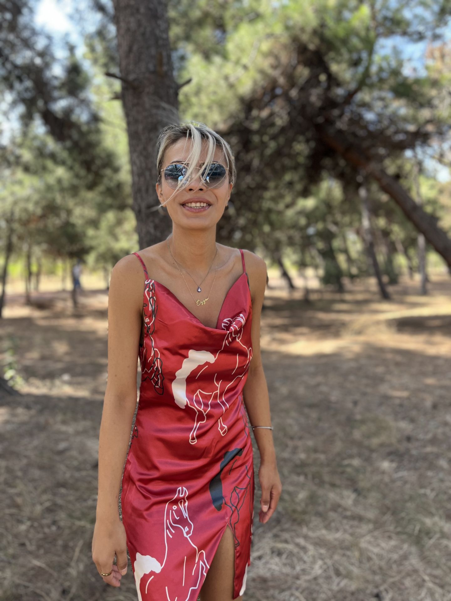 Yırtmaçlı askılı at desenli elbise